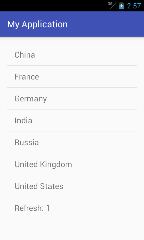 El despliegue de una lista para indicar una actualización manual se conoce como el gesto Desplazar. Es una característica tan común que esta funcionalidad se ha encapsulado en un solo widget llamado SwipeRefreshLayout. Se hará la demostración de utilizar el widget para agregar la función Actualizar con un ListView. La siguiente captura de pantalla muestra la actualización en acción: